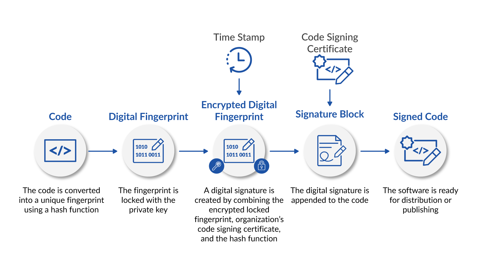 Der Code-Signing-Prozess funktioniert mithilfe von Public-Key-Kryptografie und kryptografischem Hashing, um eine digitale Signatur zu erstellen, die ein Softwarepaket mit einer verifizierten Herausgeberidentität verknüpft. Wenn der Code signiert wird, wird ein eindeutiger Fingerabdruck der Software erstellt, mit dem privaten Schlüssel des Herausgebers verschlüsselt und zusammen mit dem Code-Signing-Zertifikat an den Code angehängt, damit er vor der Verteilung überprüft werden kann.